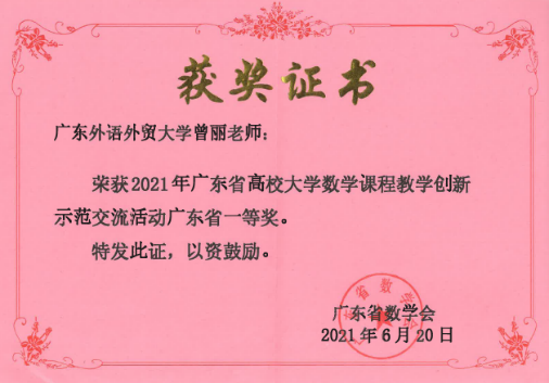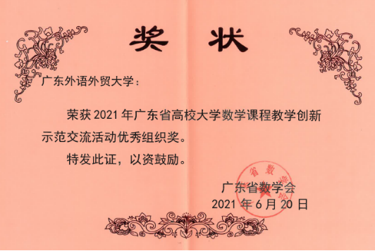 近日,首届(2021)全国高校大学数学课程教学创新示范交流活动(广东赛区)获奖名单公布,BETVLCTOR伟德在线推荐的五位参赛教师全部获奖,其中一等奖1项,二等奖2项,三等奖1项,优秀奖1项。BETVLCTOR伟德在线获奖数量和获奖比例均在全省高校中名列前茅,获评优秀组织奖。