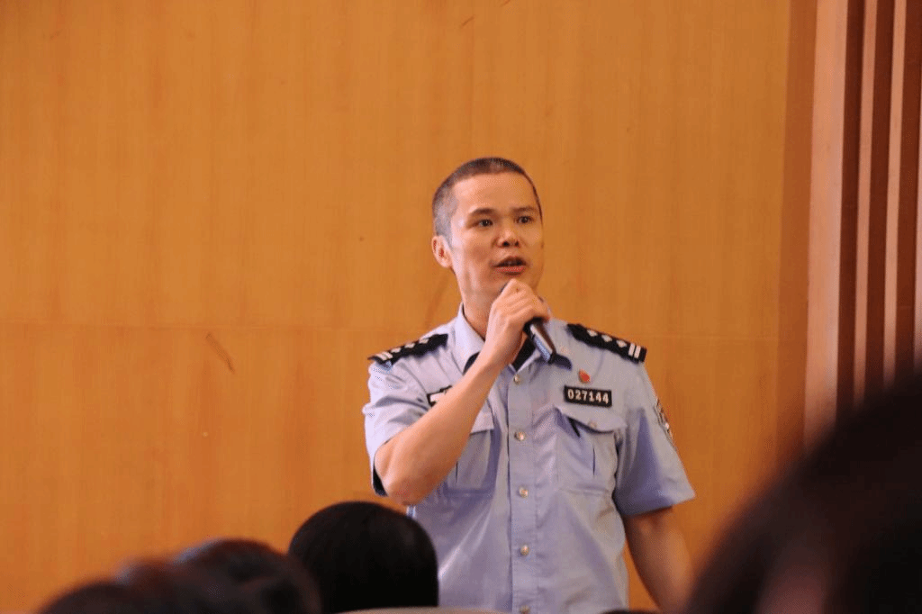 接着,驻校民警邱警官展开了防诈骗的知识宣讲。首先,邱警官罗列了网络诈骗的类型,并播放了相关视频。接着,他详细地分析了部分诈骗案件,并告知学生们如何识别“骗术”。一桩桩真实的事例、一个个触目惊心的金额数字,提醒学生们要提高警惕,谨防上当。最后,他建议全体同学起立,大声地喊出各个诈骗案件的“骗术”,使教育活动深入人心。