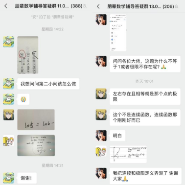 朋辈数学辅导活动为同学们提供了面对面交流探讨途径与场所,线上答疑群实现了“同学有问题随时问”,致力于及时有效解决每一个数学问题,极大提高学生学习效率,营造优良学风。