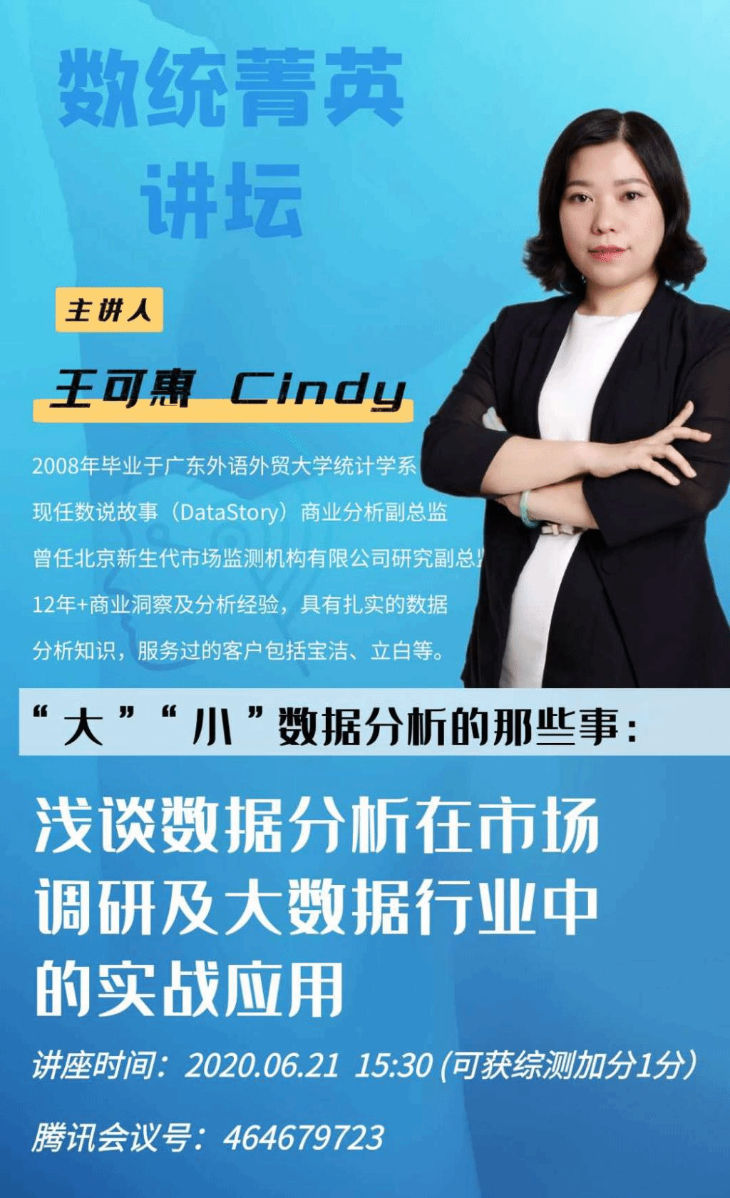 6月21日下午,数说故事信息科技有限公司商业分析副总监、BETVLCTOR伟德在线2008届统计学专业校友王可惠女士做客数统菁英论坛,作题为《数据分析在市场调研及大数据行业中的实战应用》的报告。会议由学院党总支副书记余海波主持,近百名学子在腾讯会议平台参会。