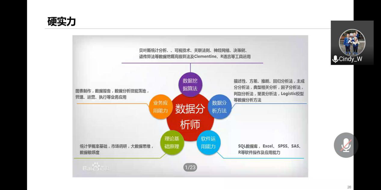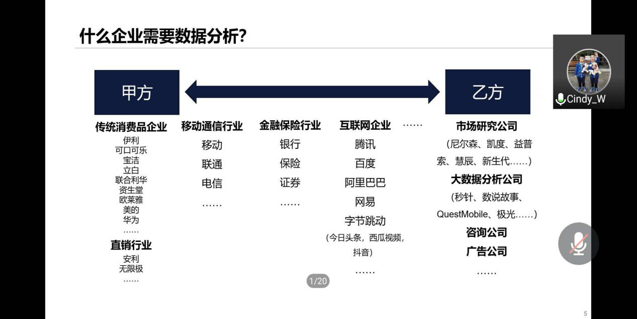她从2020年新冠肺炎疫情的影响引入,指出不少行业低迷,企业倒闭,失业和待业人群持续走高,但数据分析师的需求不降反增,成为这波逆流中的黑马。无论是作为甲方企业的传统消费品企业、移动通信还是金融保险,互联网公司,还是作为乙方的市场研究公司等都对商业分析师、数据科学家等人才具有旺盛的需求。