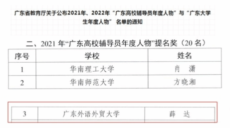 为深入学习贯彻习近平总书记关于高校思想政治工作的重要论述,大力培养选树新时代广东高校辅导员先进榜样,引导广大辅导员不忘立德树人初心,牢记为党育人、为国育才使命,广东省教育厅组织开展了2021年“广东高校辅导员年度人物”推选展示活动。BETVLCTOR伟德在线辅导员薛达老师荣获“2021年广东高校辅导员年度人物”提名奖。